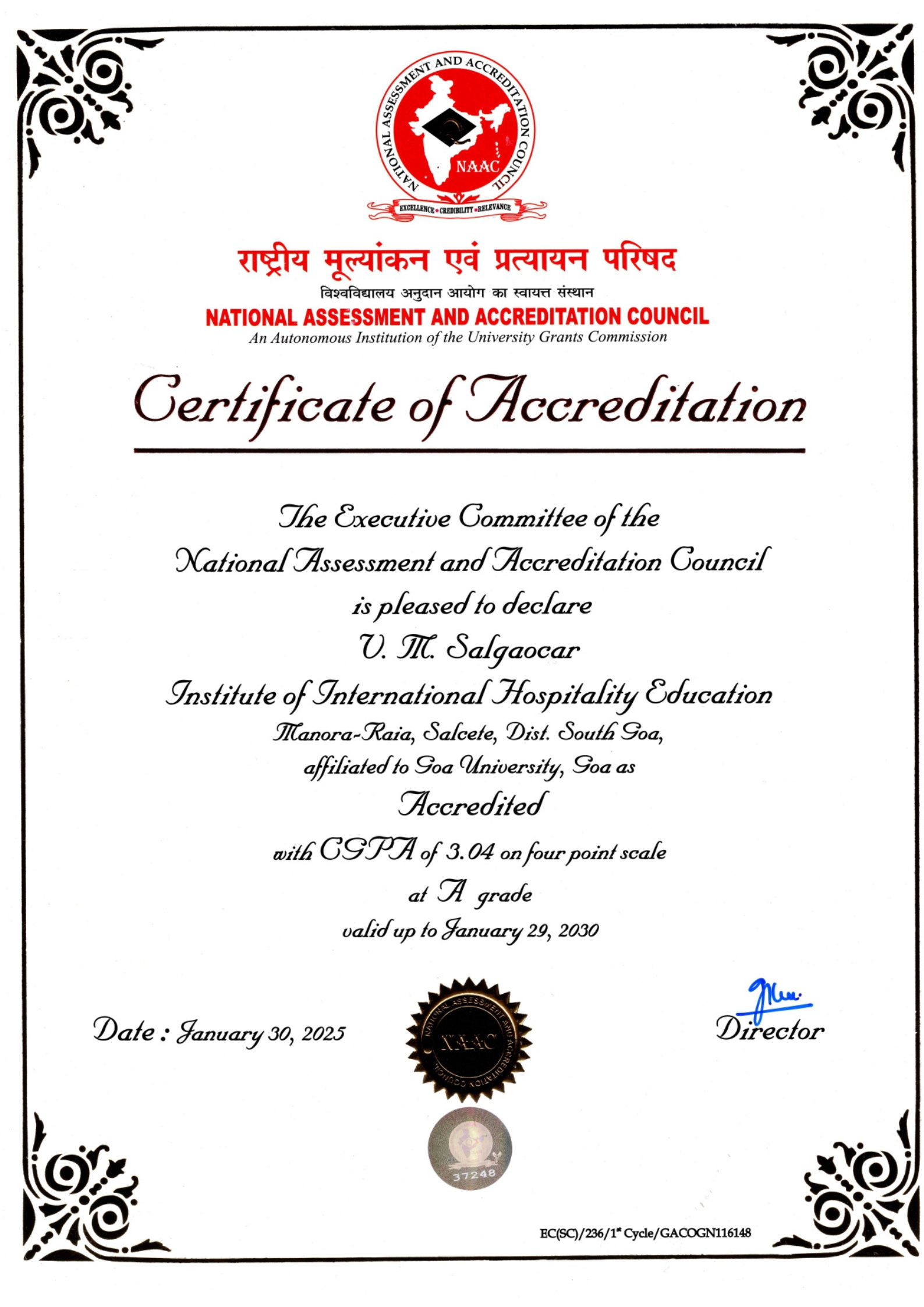 Accredited with an ‘A’ Grade by NAAC in its very first cycle, VMSIIHE offers globally aligned undergraduate B.Sc. Programmes in International Hospitality Management and B.Sc. in Culinary Arts, based on the Curriculum and Credit Framework for Undergraduate Programmes (CCFUP) under National Education Policy (NEP) 2020 and a postgraduate M.Sc. Programme in International Hospitality & Tourism Management, based on the Choice Based Credit System of Instruction based on NEP 2020.